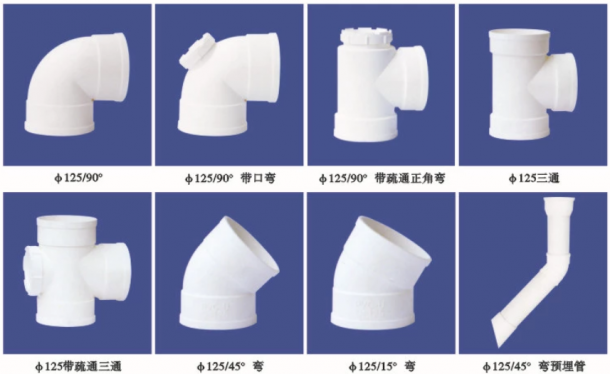 Φ125/90°彎頭,Φ125/90°帶口彎頭,Φ125/90°帶疏通正角彎頭,Φ125三通,Φ125帶疏通三通,Φ125/45°彎管,Φ125/15°彎管,Φ125/45°彎預(yù)埋管,Φ125*200*8下接管,Φ125外接管箍,Φ125直管,Φ160*300*8、Φ160*400*8、Φ160*510*8預(yù)埋管,Φ125*300*8斜底、平地預(yù)埋管,Φ125*400*8、Φ125*510*8預(yù)埋管,Φ170*38管蓋,Φ135*38管蓋,200*250*10管篦,250*200*10管篦,200*150*10、200*150*20管篦及Φ125吊卡管卡等多種配件。